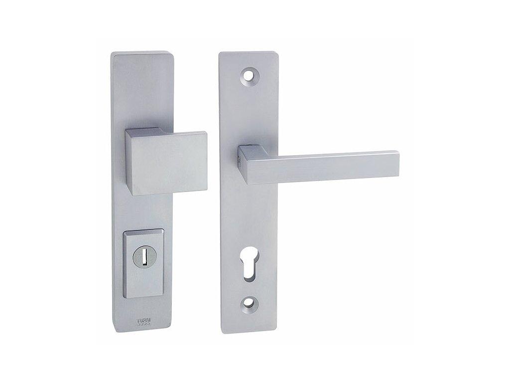 Štítová kľučka na vchodové a bezpečnostné dvere s bezpečnostným hranatým štítom s prekrytím cylindrickej vložky je vyrobená z hliníka a je povrchovo upravená.Hranatý štít má rozmery 52 mm x 242 mm a hrúbku 15 mm.