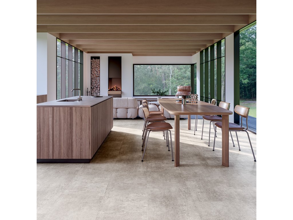 Štvorstranná V-drážka zvýrazňuje jednotlivé lamely a dodáva podlahe autentický vzhľad prírodného kameňa. Materiál má emisnú triedu E1, čo znamená nízke emisie a bezpečné použitie v interiéri.