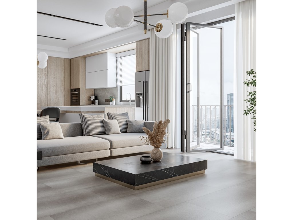 Štvorstranná V-drážka zvýrazňuje jednotlivé lamely a dodáva podlahe autentický vzhľad prírodného kameňa. Materiál má emisnú triedu E1, čo znamená nízke emisie a bezpečné použitie v interiéri.