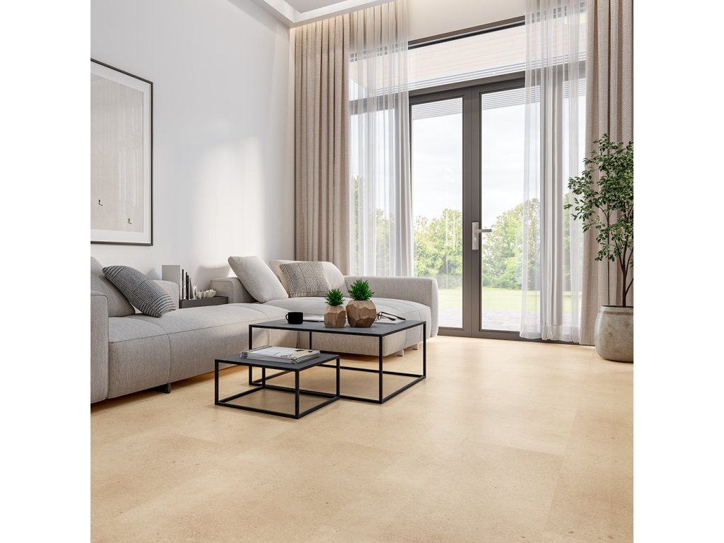 Štvorstranná V-drážka zvýrazňuje jednotlivé lamely a dodáva podlahe autentický vzhľad prírodného kameňa. Materiál má emisnú triedu E1, čo znamená nízke emisie a bezpečné použitie v interiéri.